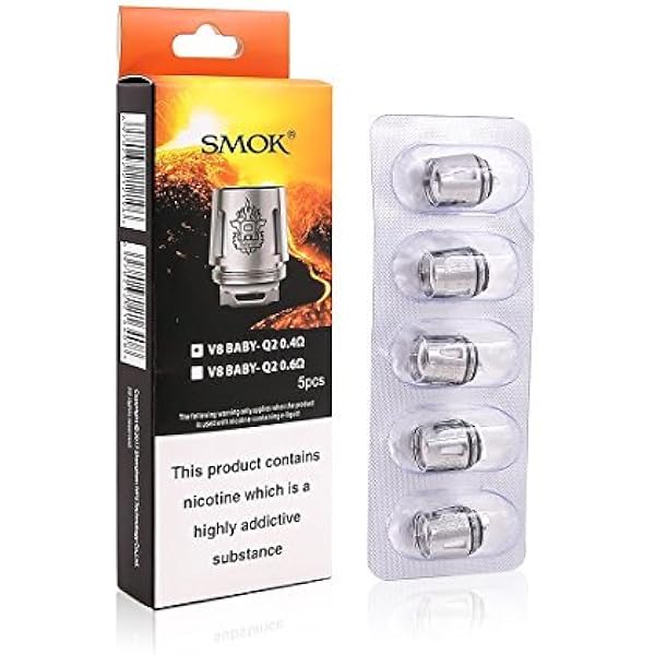 The smok v8 baby q2 replacement coils resistance is 0 4ohm the vertical baby beast q2 coils will bring you better taste flavor when operating at a lower wattage can work at 40w to 80w best work at 55w to 65w.